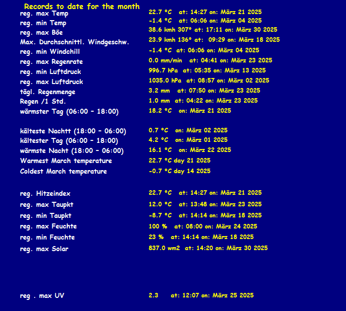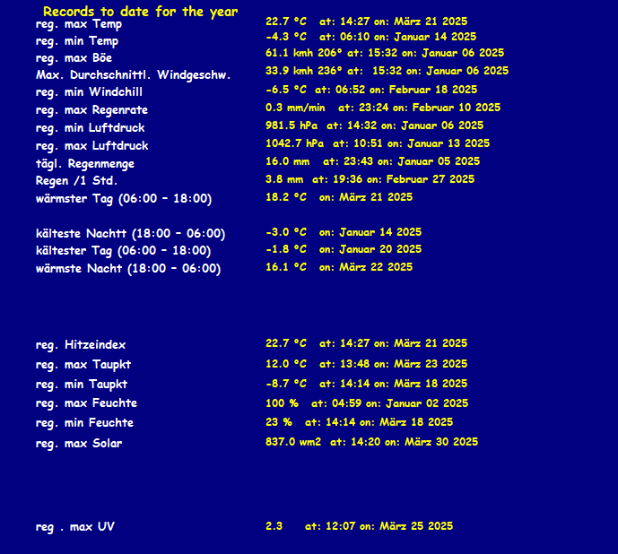 | Infos vom Webmaster: Jahres-Niederschlags-Soll für diese Station: 1019 mm, gefallen bis jetzt 34.4 mm Niederschlags-Soll für Januar = 103 mm, gefallen bis jetzt 34.4 mm, davon heute 2.0 mm Auch über WhatsApp bin ich unter 015122369876 ansprechbar |