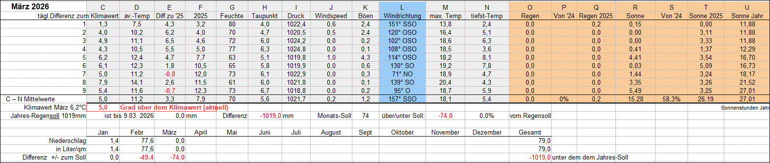 | Infos vom Webmaster: Jahres-Niederschlags-Soll für diese Station: 1019 mm, gefallen bis jetzt 131.2 mm Niederschlags-Soll für März = 74 mm, gefallen bis jetzt 0.2 mm, davon heute 0.2 mm Die ersten neun Tage dieses Monats waren hier mit 11,2 Grad im Durchschnitt fünf Grad wärmer als das langjährige Mittel (6,2 Grad) des Referenzzeitraums der Jahre 1991 bis 2020. Mittelwerte und Summen März 2026 Auch über WhatsApp bin ich unter 015122369876 ansprechbar |