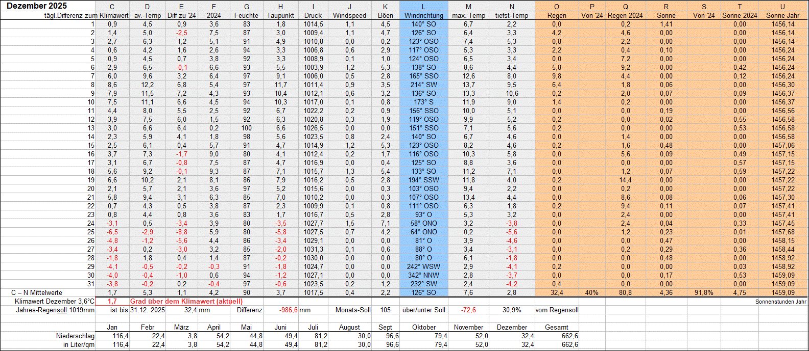 Der Dezember-Niederschlag erreichte mit 32,4mm nur rund 31% der erwarteten Regensumme von 105 mm. Mehr Zahlen gibt es hier in meinen Monatsberichten