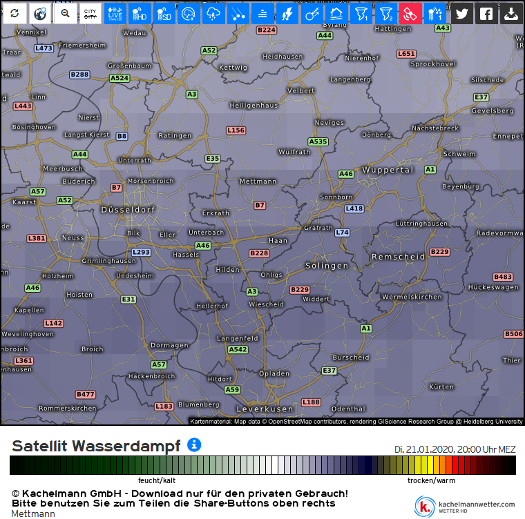 21.01. 20:38 Der Blick aus dem Fenster zeigt um 20 Uhr einen (scheinbar) klaren Sternenhimmel. Ein Satellitenbild macht den Wasserdampf in der Luft sichtbar. Oberhalb dieser dünnen Wolkenschicht mißt der Meteo-Satellit über dem Raum Solingen eine Temperatur von -2°C, bei Bodentemperatur von -1,3°C.
