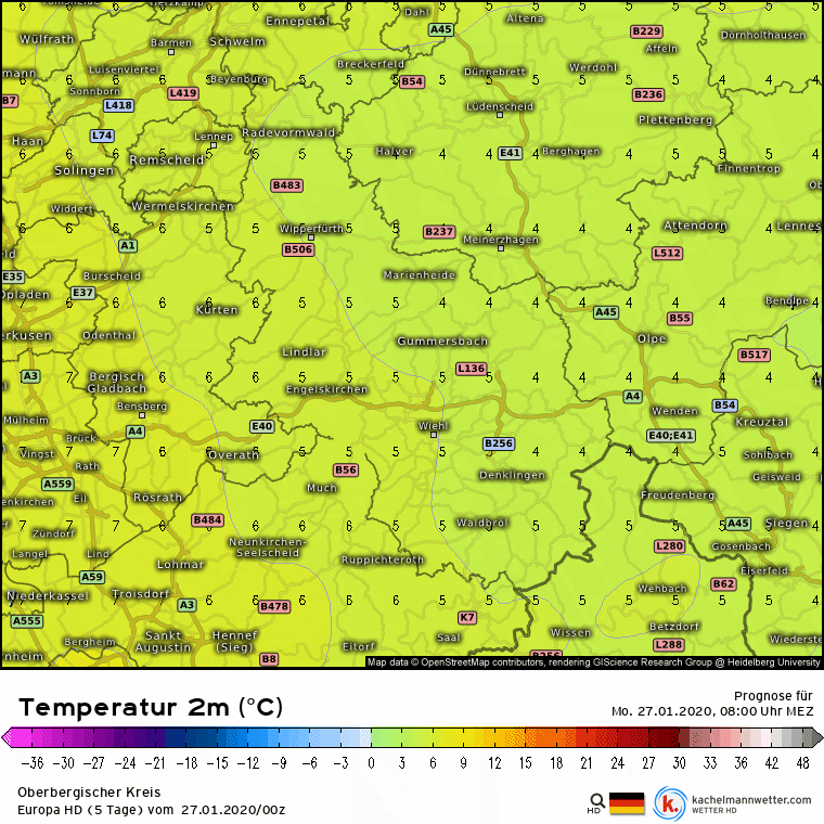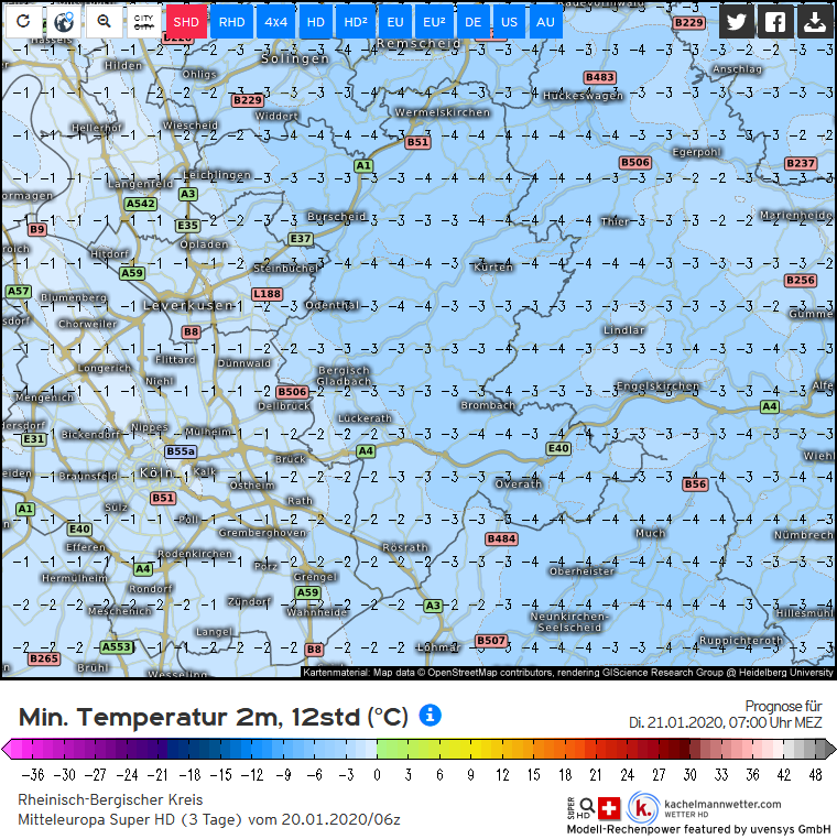 19.01. 17:22 Nach dem Mitteleuropa Super HD Modell dürften die Tiefsttemperaturen besonders auf den tieferen Lagen der Bergischen Region ab Montagabend bis Mittwochmorgen deutlich unter die Frostgrenze absinken. (Animation Kachelmannwetter)
