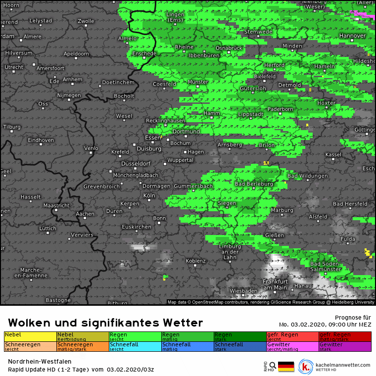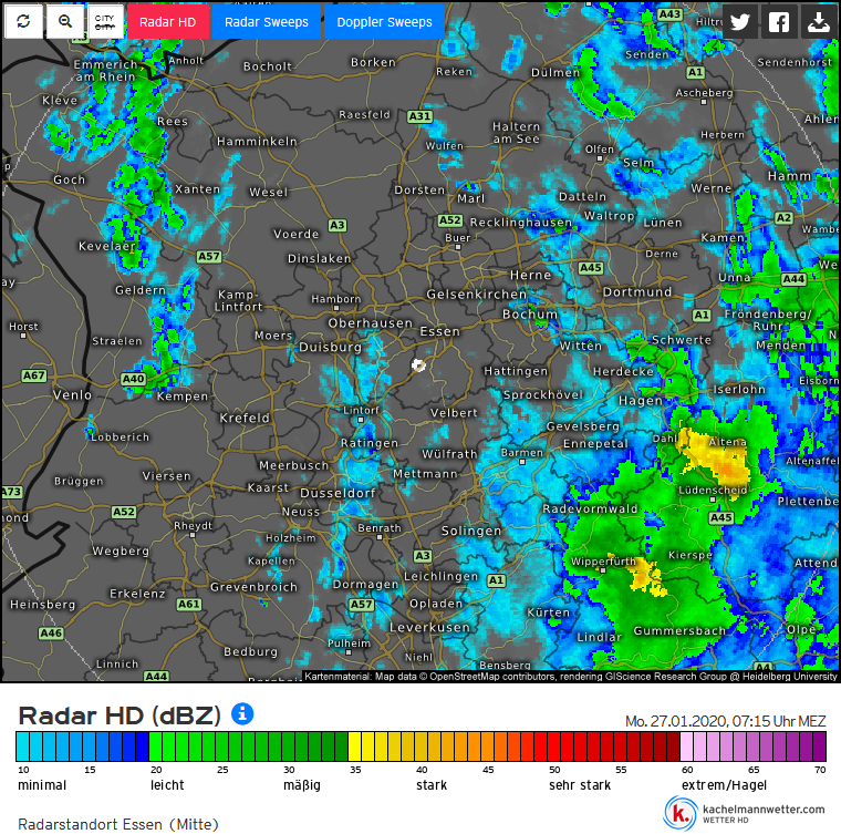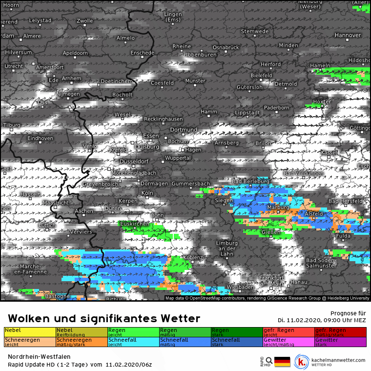Nach der Kompakt HD Vorhersage von Kachelmannwetter sollte der Regen aus der Nacht bis um 11 Uhr 11 abgetrocknet sein.