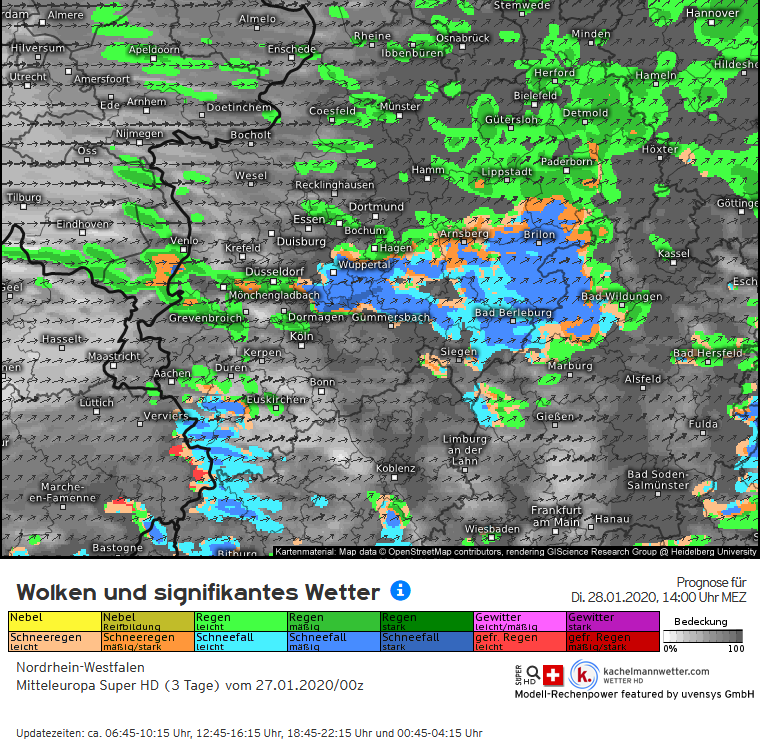 14.01. 08:00 Der zeitweise auf den Höhen stürmische Wind wird sich in in den nächsten Stunden etwas beruhigen, aber am Nachmittag wieder auffrischen. Animation der Windböen von Kachelmannwetter. Das Cosmo-Modell erwartet die stärkste Windaktivität im Bergischen Land am frühen Abend.