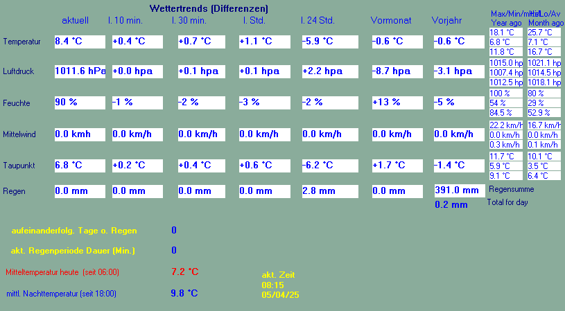 Diese Front enthält eine Kaltfront, hinter der die Temperaturen spürbar absinken werden. Aktuell messe ich hier 8,2°C,