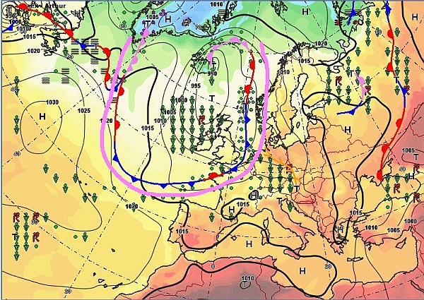 In der hier oben geschilderten Wettersituation floß feuchtere Luft der im Norden und Nordwesten liegen Tiefdruckgebiete hier ein, zeitgleich wartete das im Südwesten liegende Hoch Nino auf seine Chance.